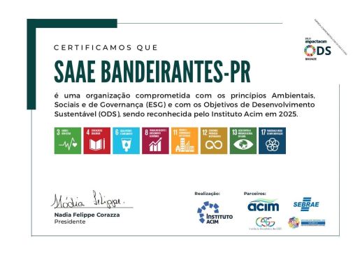 A conquista do Selo ODS Bronze reforça o empenho do SAAE Bandeirantes em atuar de forma ética, transparente e comprometida com o futuro, reafirmando seu papel como agente de transformação e desenvolvimento sustentável no município.